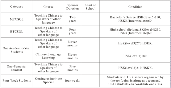 3.MTCSOL one-academic-year students, one-semester students must attend a Chinese proficiency test (HSK) and a Chinese speaking test (HSKK)before graduation, the school will get the reimbursement of examination fee from scholarship students training funds