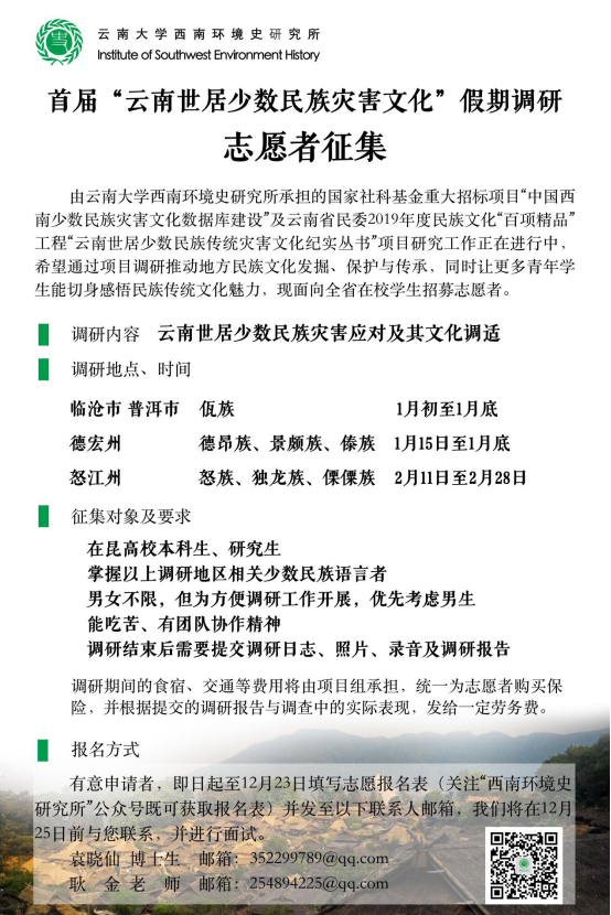 云南大学西南环境史研究所承担国家社科基金重大招标项目“中国西南少数民族灾害文化数据库建设”及云南省民族宗教委2019年度民族文化“百项精品”工程“云南世居少数民族传统灾害文化纪实丛书”项目研究工作。希望通过项目调研,发掘少数民族在应对灾害过程中形成的文化、习俗等,搜集、整理流散在民间、即将被现代化堙没的少数民族灾害文化。同时让更多青年学生通过参与调研,切身感受民族传统文化魅力。现向在昆高校学生招募志愿者,由研究团队老师带队前往田野点进行实地调研。具体情况如下:
