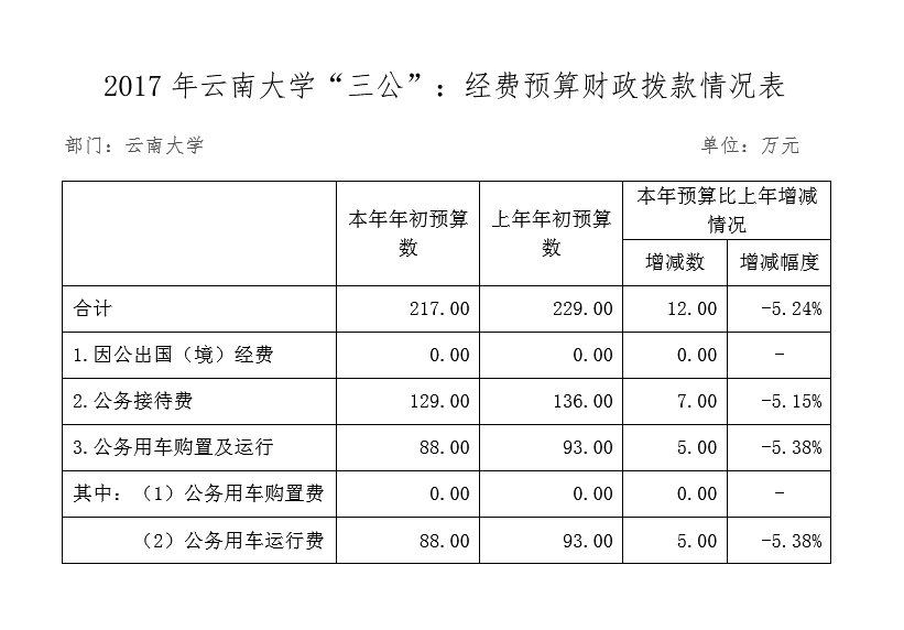 云南大学2017年财政拨款“三公”经费预算合计217万元,其中,因公出国(境)费支出0万元(上级部门未要求作预算,按实际发生数列支),公务用车购置及运行维护费支出88万元(其中,公务用车购置支出0万元,公务用车运行维护费支出88万元),公务接待费支出129万元。2017年“三公”经费预算数比2016年预算数减少12万元。