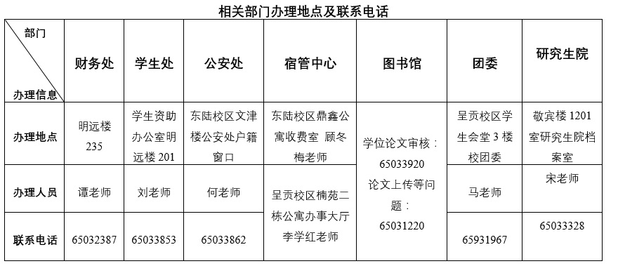 研究生(硕博)必办环节:财务处、图书馆、学生公寓管理中心、学生资助办、学院党委、研究生院(档案)、论文上传、领取证件(学院)