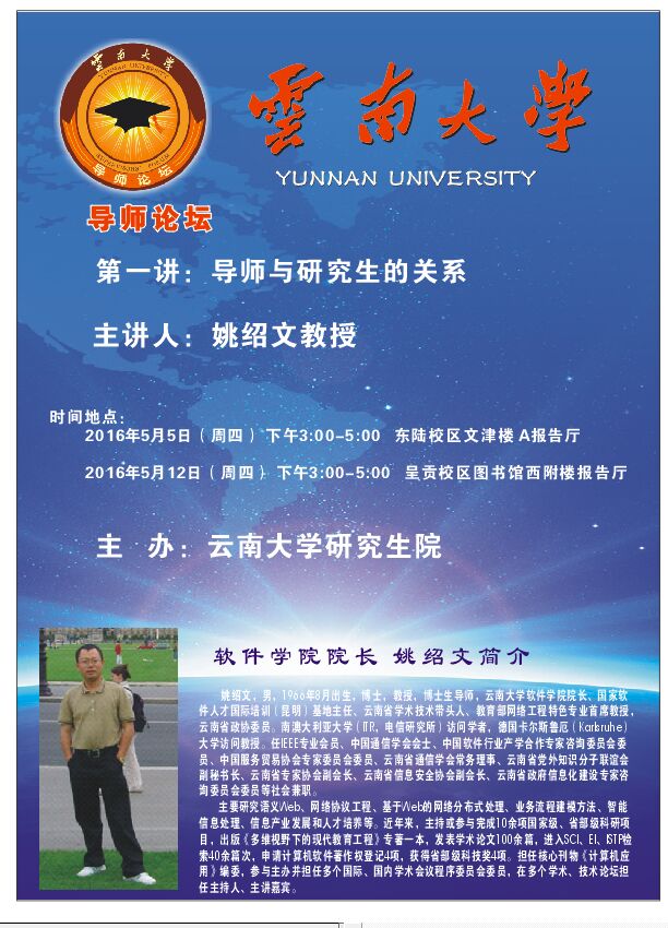 由云南大学研究生院主办的导师论坛即将开讲,论坛邀请学校各个专业领域的知名学者为广大研究生授课,通过为全校研究生提供一个多视角、宽视域、高层次学术交流平台,开阔学生学术视野、激发学术热情、活跃学术思想、提高创新能力,达到提升研究生培养质量的目的。