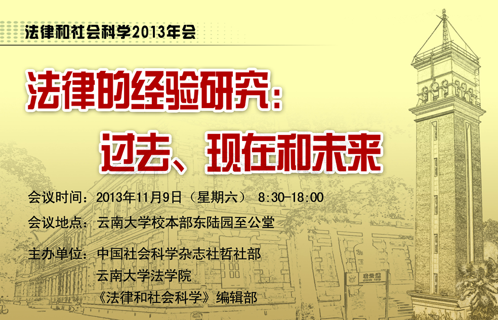 由中国社会科学杂志社哲社部、云南大学法学院、《法律和社会科学》编辑部共同主办的“法律和社会科学2013年会——法律的经验研究:过去、现在和未来”即将在云南大学召开。