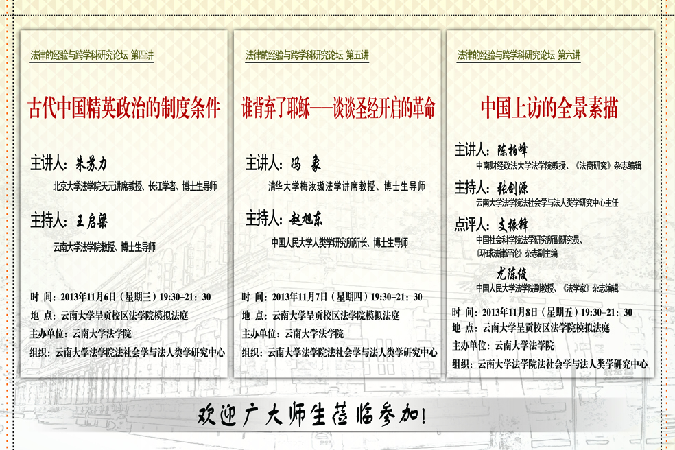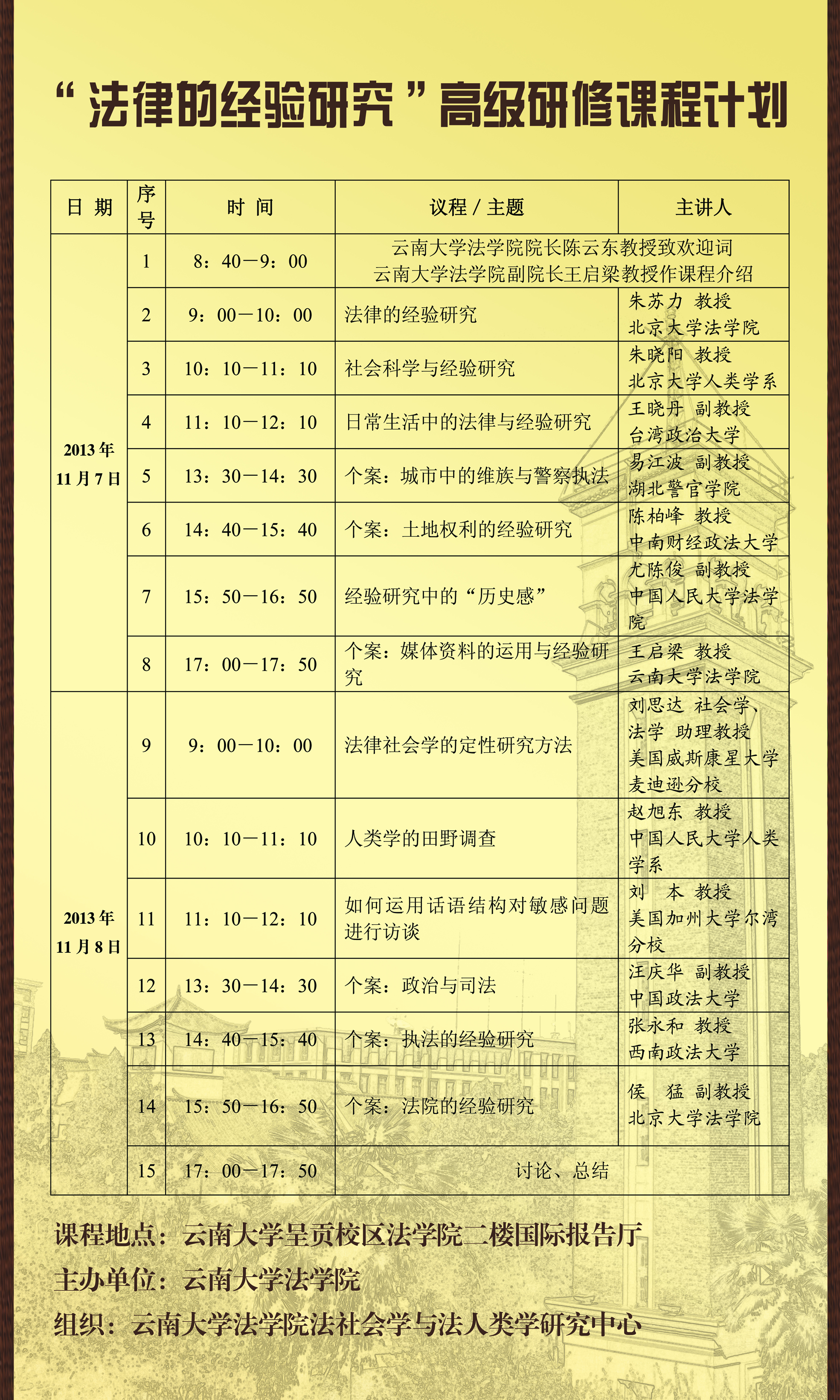 除“年会”外,包括“法律的经验研究”高级研修课程、“法律的经验研究与跨学科研究论坛”系列学术讲座等一系列学术和教研活动将陆续在云南大学展开。
